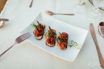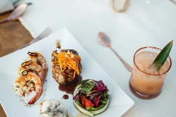 Be welcomed with a signature Cocktail and an antipasto platter of charcuterie, cheeses, olives, melon, nuts & bruschettas. For Dinner, the Baja Duo; Jumbo shrimp Kabob over a delicious beef filet* with red wine sauce, accompanied by organic green salad. Vegan and white meats options provided. For Dessert, we serve red fruits & mango over a delicious traditional Mexican “ate” Jam on a layer of wonton.